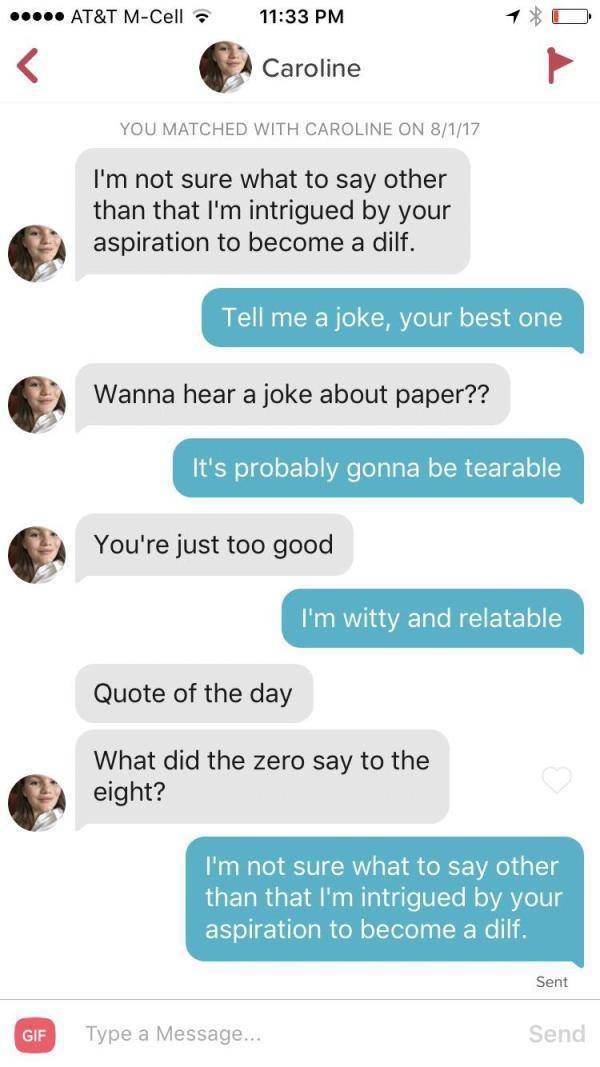 A good discussion normally begins with an amusing matter generating funny dialogue starters a great solution to kick-off. But some playful teasing and sarcasm can take you a long. Data analysis by Tinder revealed that GIFs are 30 more likely to get a.